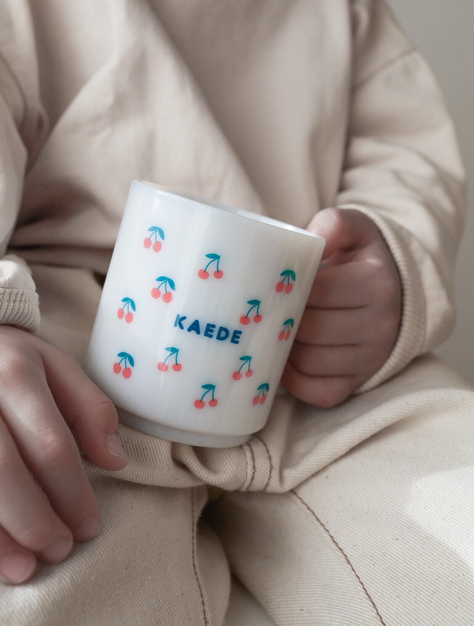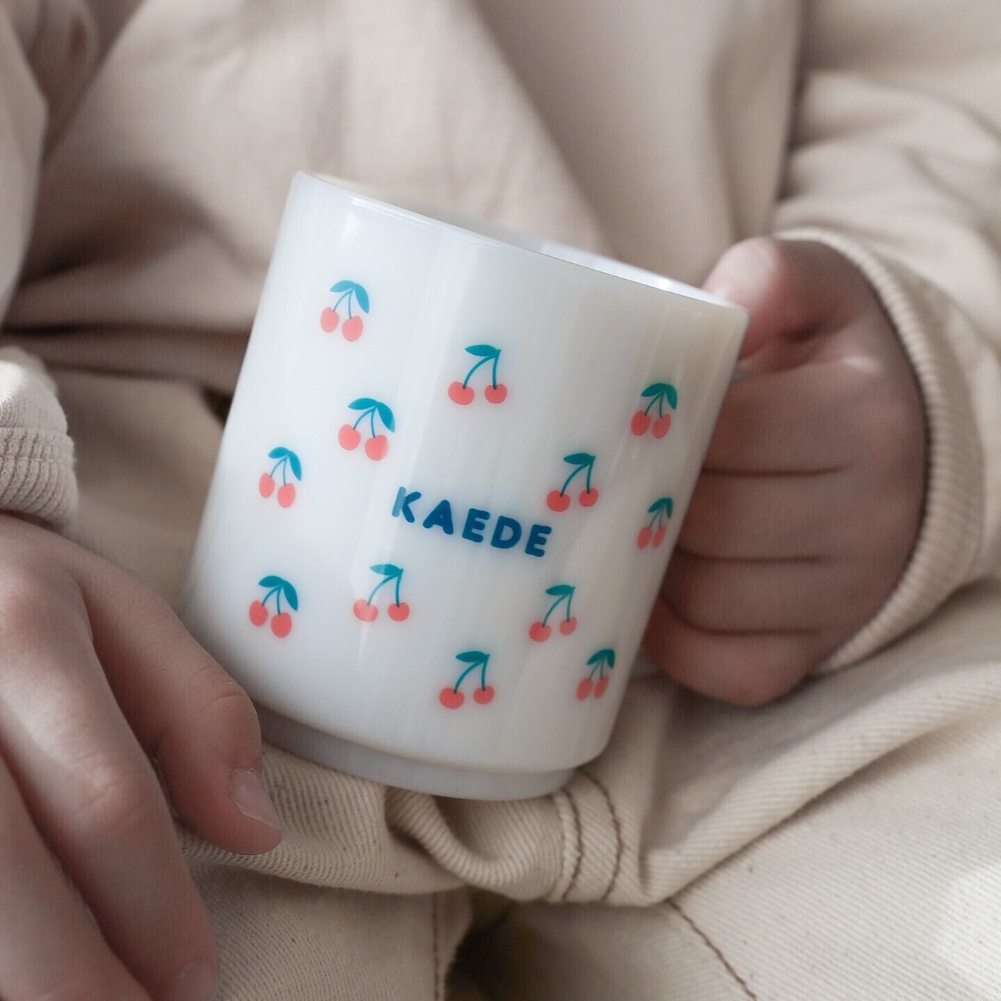 さくらんぼ柄の元気な色彩にお名前が入ったデザイン。